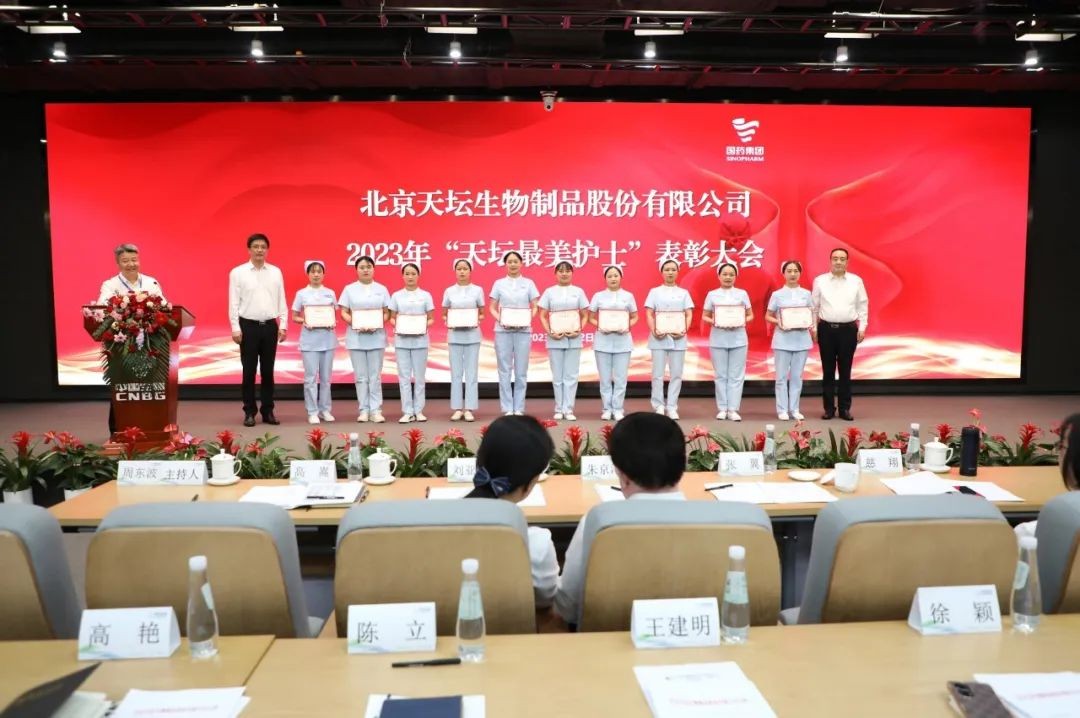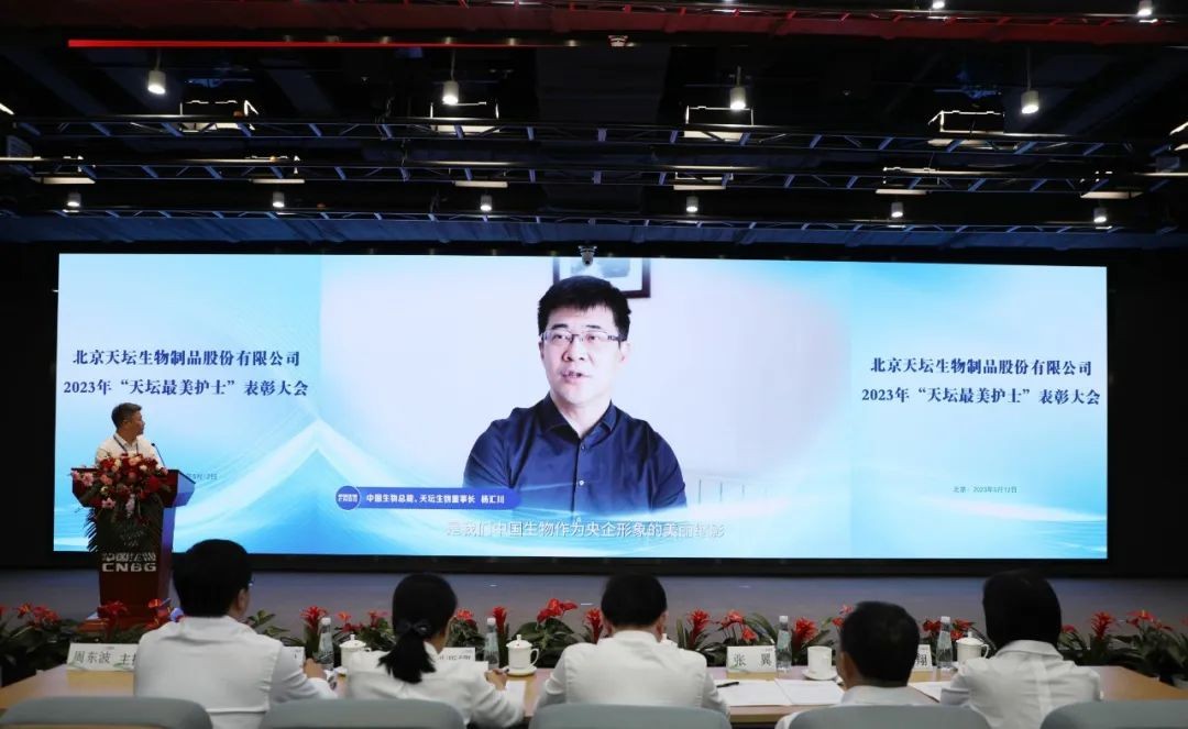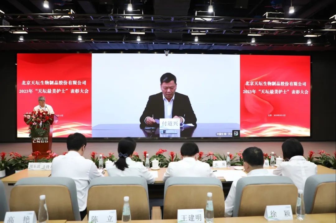 5月12日,2023年“天壇最美護(hù)士”表彰大會在北京舉行。中國生物黨委書記朱京津,天壇生物總經(jīng)理付道興,黨委書記劉亞娜,副總經(jīng)理何彥林,副總經(jīng)理兼財務(wù)總監(jiān)張翼,紀(jì)委書記高嵩出席會議。天壇生物常務(wù)副總經(jīng)理周東波主持會議。