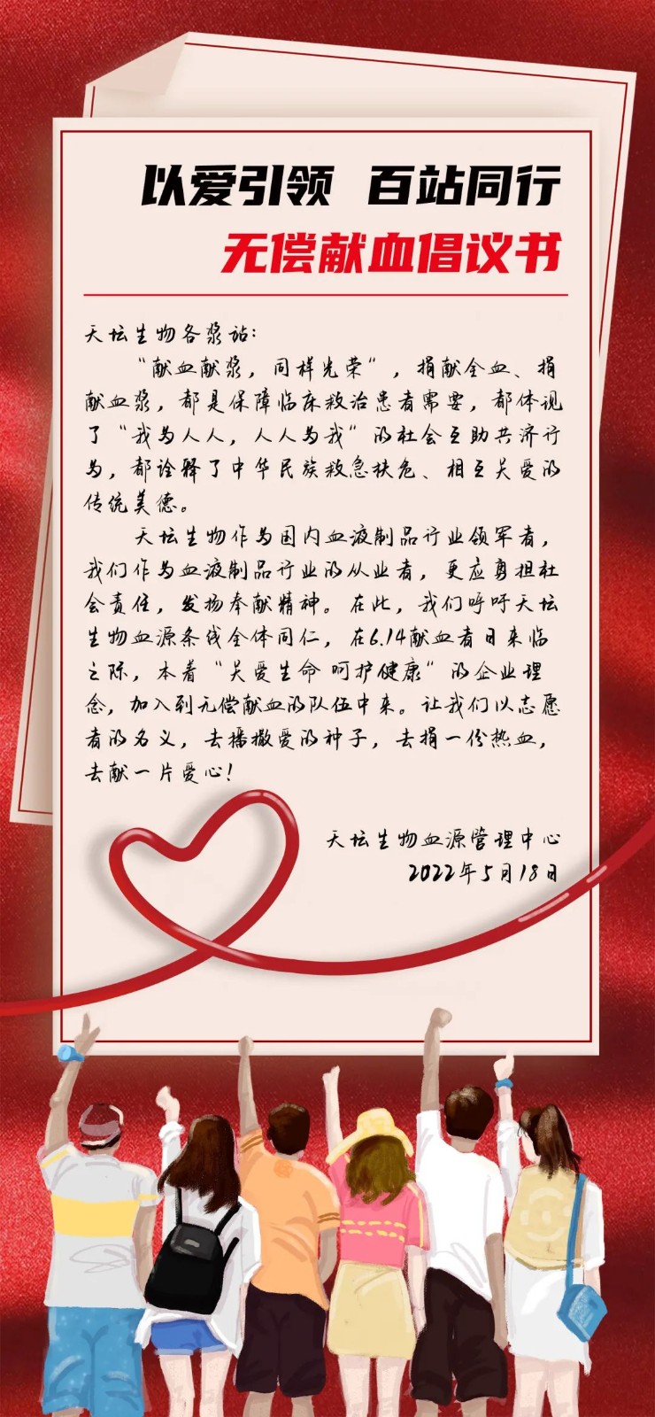 2022年6月14日,是第19個"世界獻血者日",天壇生物在全國各漿站組織了一場"以愛引領(lǐng) 百站同行"公益獻血活動。